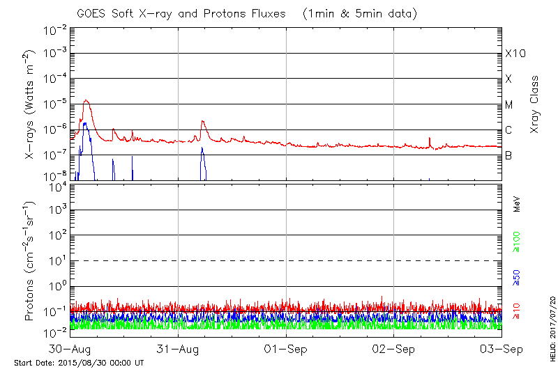 This page provides light-curves generated from GOES soft X-ray and Particle data for the date indicated at the top and the preceding three days.