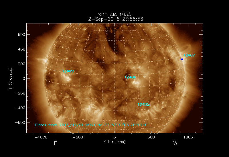 All soft X-ray flares (≥A1.0) where the location has been determined are shown; the flare locations are rotated to the time of the image