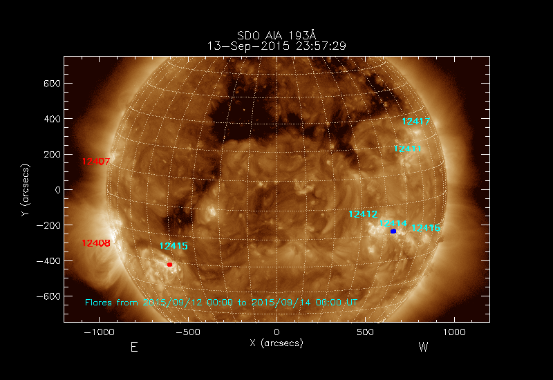The most recent flares (≤12 hours) are shown as red dots, 12-24 hours ago as blue dots and older ones as turquoise dots.