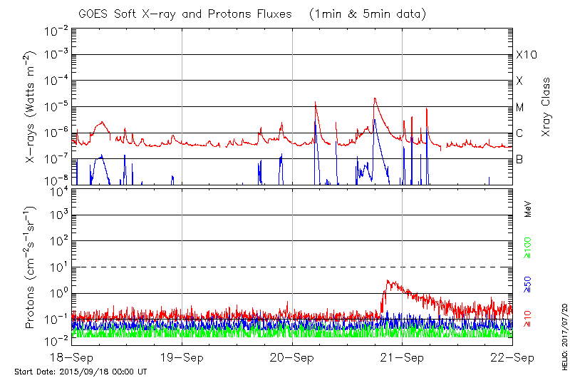 This page provides light-curves generated from GOES soft X-ray and Particle data for the date indicated at the top and the preceding three days.