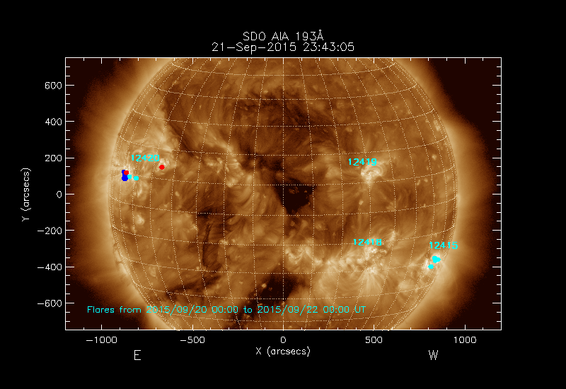 The most recent flares (≤12 hours) are shown as red dots, 12-24 hours ago as blue dots and older ones as turquoise dots.