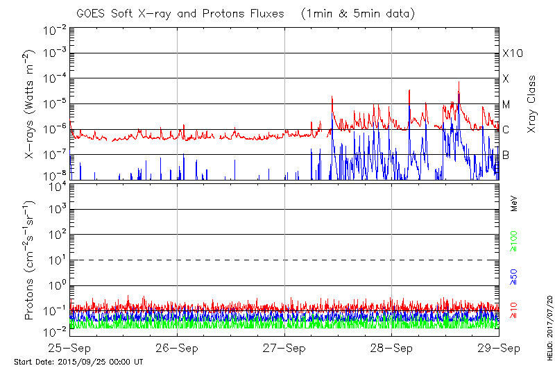 This page provides light-curves generated from GOES soft X-ray and Particle data for the date indicated at the top and the preceding three days.