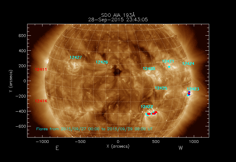 shows the locations soft X-ray flares that occurred within