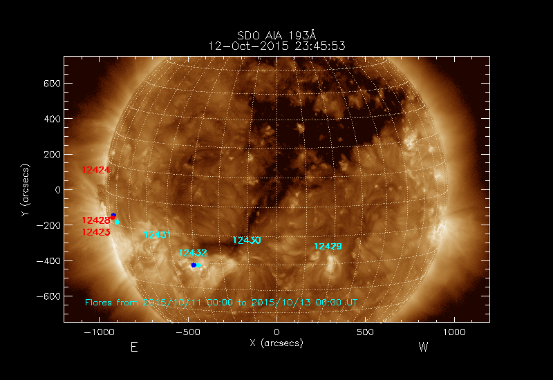All soft X-ray flares (≥A1.0) where the location has been determined are shown; the flare locations are rotated to the time of the image