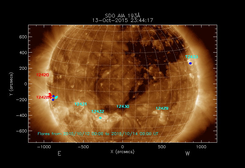 Flares for the 48 hours leading up to the time are over-plotted; these are rotated to the time of the FITS image.
