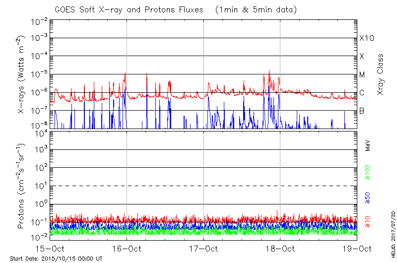 This page provides light-curves generated from GOES soft X-ray and Particle data for the date indicated at the top and the preceding three days.