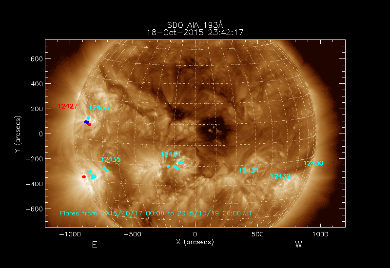 All soft X-ray flares (≥A1.0) where the location has been determined are shown; the flare locations are rotated to the time of the image