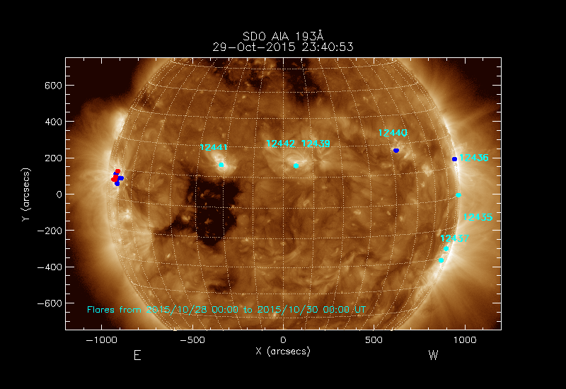 Flares for the 48 hours leading up to the time are over-plotted; these are rotated to the time of the FITS image.
