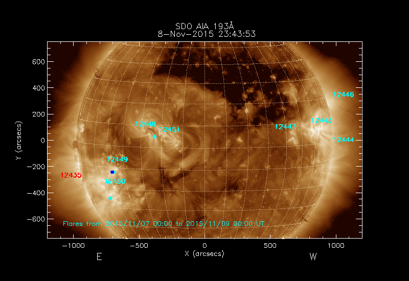 Click on an Active Region plot to display the Region Report including the region evolution and flaring history. HEC Search for NOAA Active Regions (SRS) records for this date and the day before.