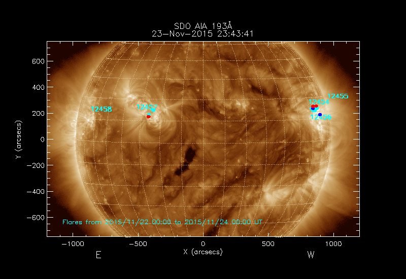 shows the locations soft X-ray flares that occurred within