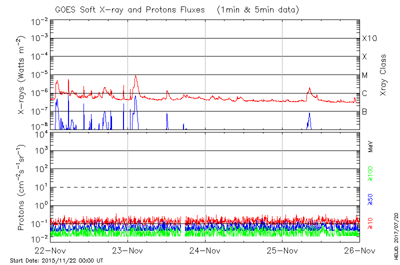 This page provides light-curves generated from GOES soft X-ray and Particle data for the date indicated at the top and the preceding three days.