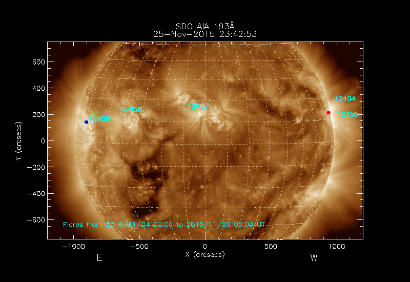 those in red (on the left hand side of the image) indicate where old Active Regions that could be returning.