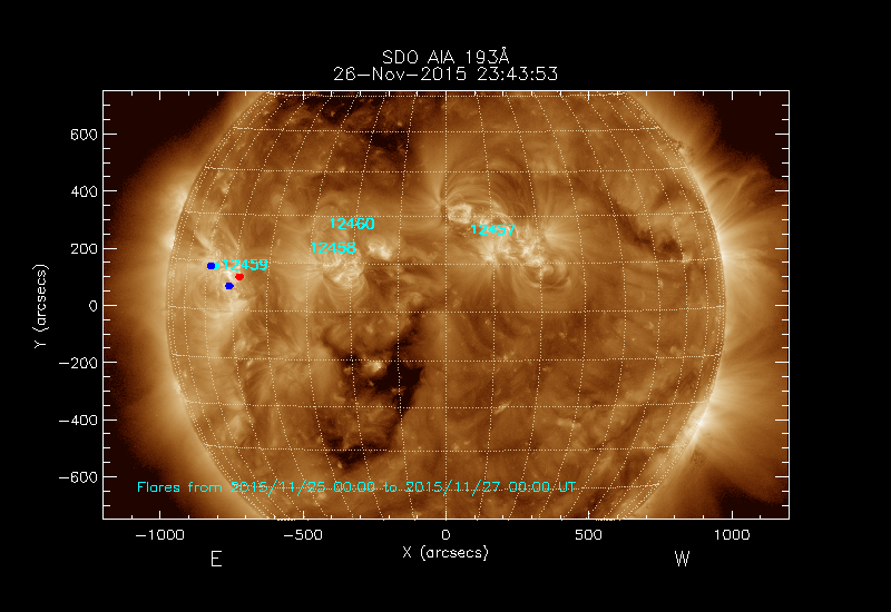 The most recent flares (≤12 hours) are shown as red dots, 12-24 hours ago as blue dots and older ones as turquoise dots.