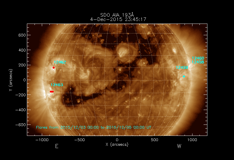 Click on an Active Region plot to display the Region Report including the region evolution and flaring history. HEC Search for NOAA Active Regions (SRS) records for this date and the day before.
