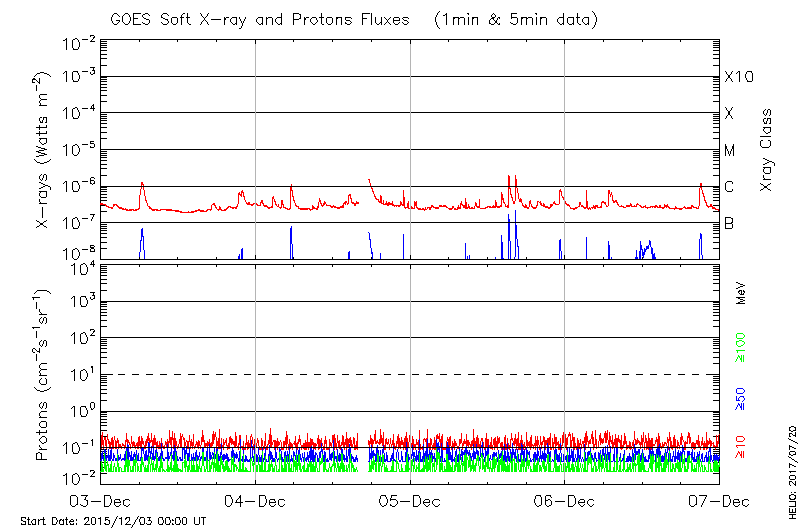 This page provides light-curves generated from GOES soft X-ray and Particle data for the date indicated at the top and the preceding three days.