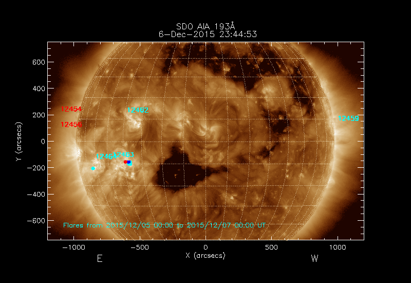The locations of the flares over-plotted on the image are derived from the flare catalogue