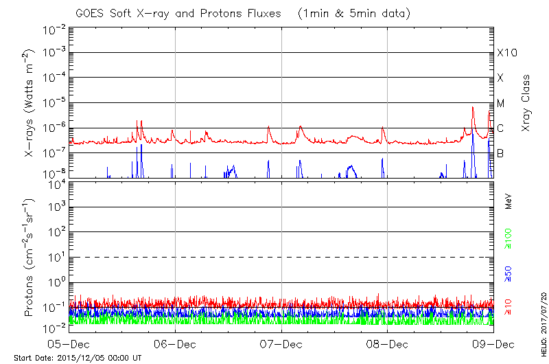 This page provides light-curves generated from GOES soft X-ray and Particle data for the date indicated at the top and the preceding three days.