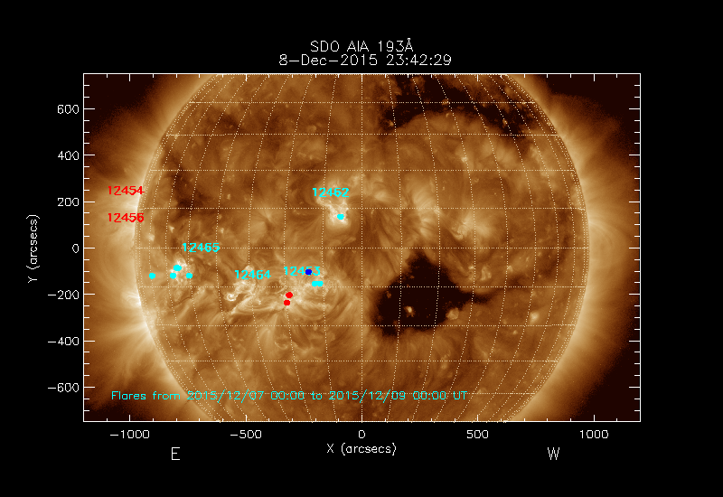 The most recent flares (≤12 hours) are shown as red dots, 12-24 hours ago as blue dots and older ones as turquoise dots.