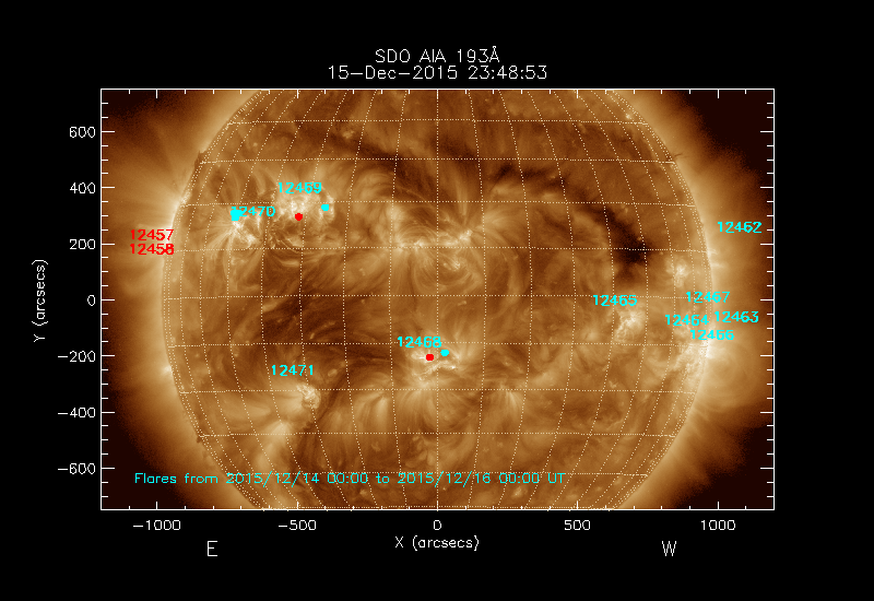 The locations of the flares over-plotted on the image are derived from the flare catalogue