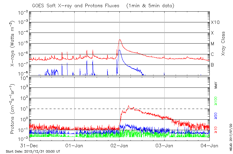 This page provides light-curves generated from GOES soft X-ray and Particle data for the date indicated at the top and the preceding three days.