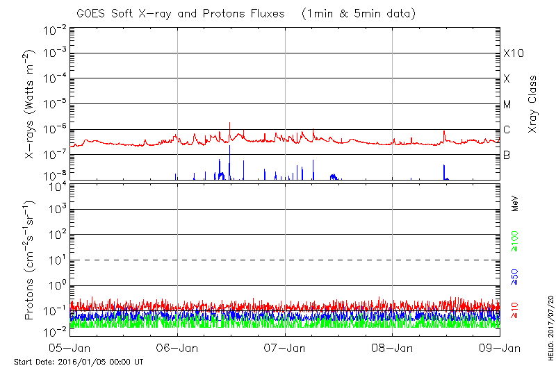 This page provides light-curves generated from GOES soft X-ray and Particle data for the date indicated at the top and the preceding three days.