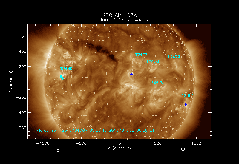 The locations of the flares over-plotted on the image are derived from the flare catalogue