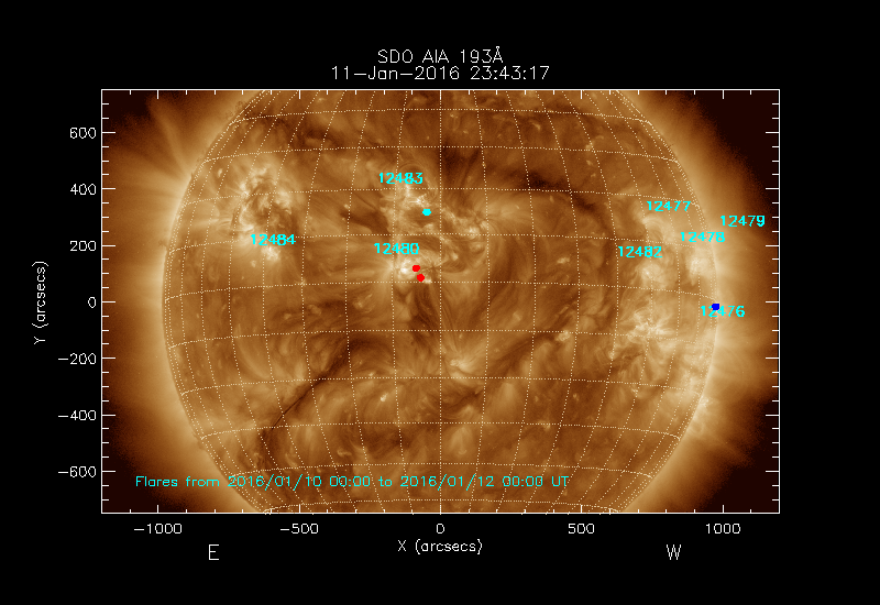 The most recent flares (≤12 hours) are shown as red dots, 12-24 hours ago as blue dots and older ones as turquoise dots.