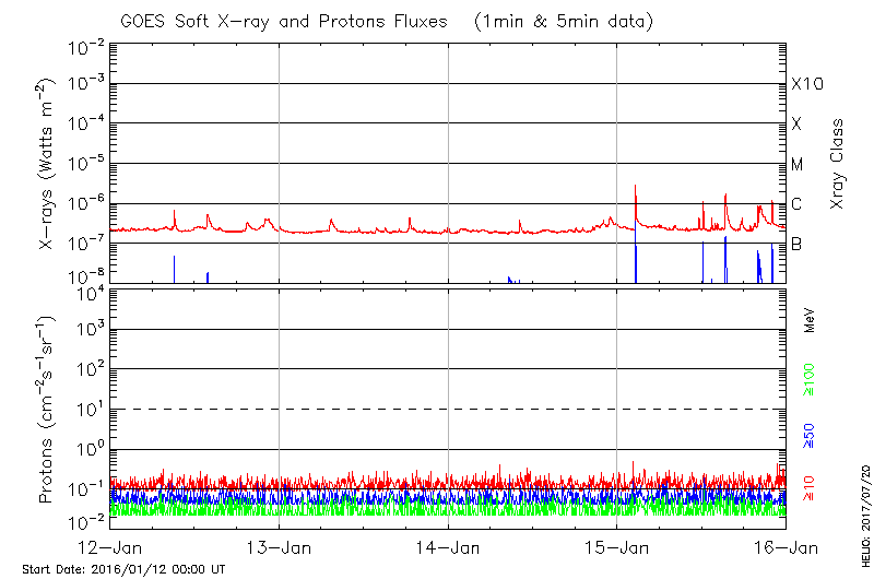 This page provides light-curves generated from GOES soft X-ray and Particle data for the date indicated at the top and the preceding three days.