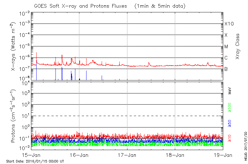 This page provides light-curves generated from GOES soft X-ray and Particle data for the date indicated at the top and the preceding three days.