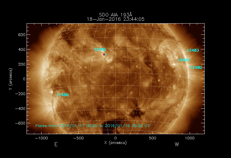 The most recent flares (≤12 hours) are shown as red dots, 12-24 hours ago as blue dots and older ones as turquoise dots.