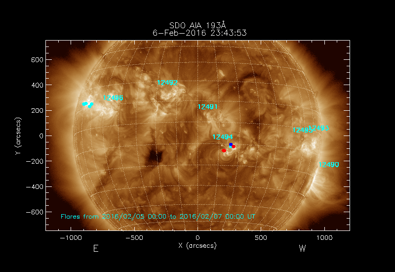Flares for the 48 hours leading up to the time are over-plotted; these are rotated to the time of the FITS image.