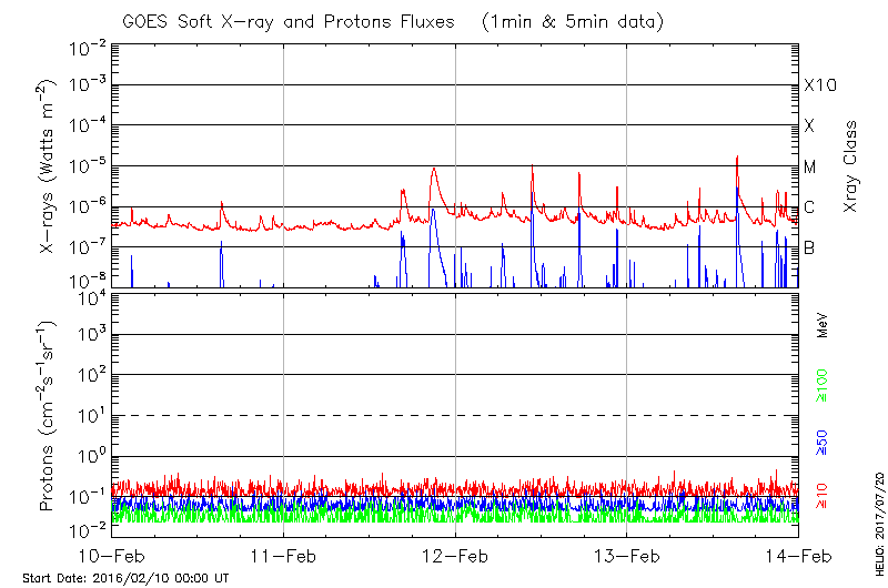 This page provides light-curves generated from GOES soft X-ray and Particle data for the date indicated at the top and the preceding three days.