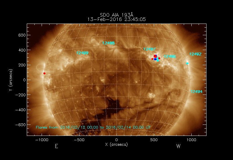 The most recent flares (≤12 hours) are shown as red dots, 12-24 hours ago as blue dots and older ones as turquoise dots.