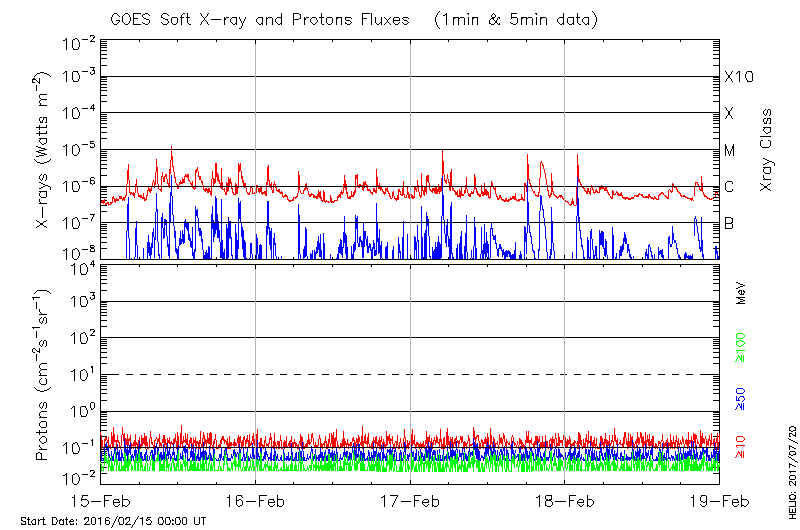 This page provides light-curves generated from GOES soft X-ray and Particle data for the date indicated at the top and the preceding three days.