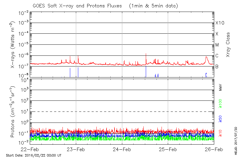 This page provides light-curves generated from GOES soft X-ray and Particle data for the date indicated at the top and the preceding three days.