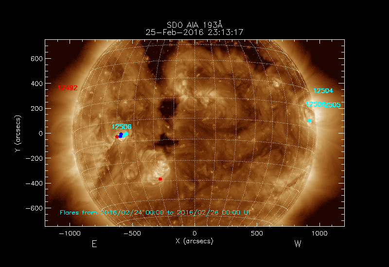 The most recent flares (≤12 hours) are shown as red dots, 12-24 hours ago as blue dots and older ones as turquoise dots.
