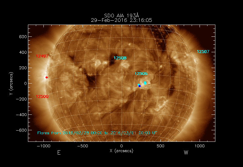 The most recent flares (≤12 hours) are shown as red dots, 12-24 hours ago as blue dots and older ones as turquoise dots.