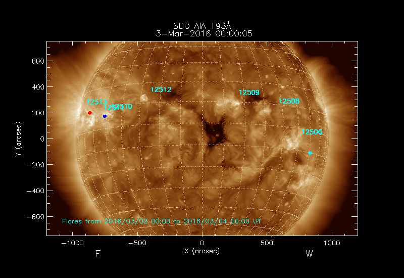 Click on an Active Region plot to display the Region Report including the region evolution and flaring history. HEC Search for NOAA Active Regions (SRS) records for this date and the day before.