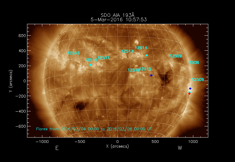Flares for the 48 hours leading up to the time are over-plotted; these are rotated to the time of the FITS image.