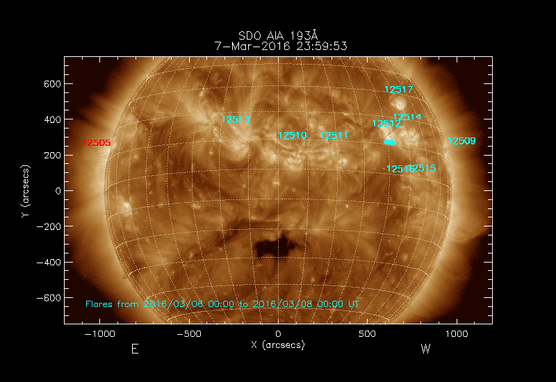Click on an Active Region plot to display the Region Report including the region evolution and flaring history. HEC Search for NOAA Active Regions (SRS) records for this date and the day before.