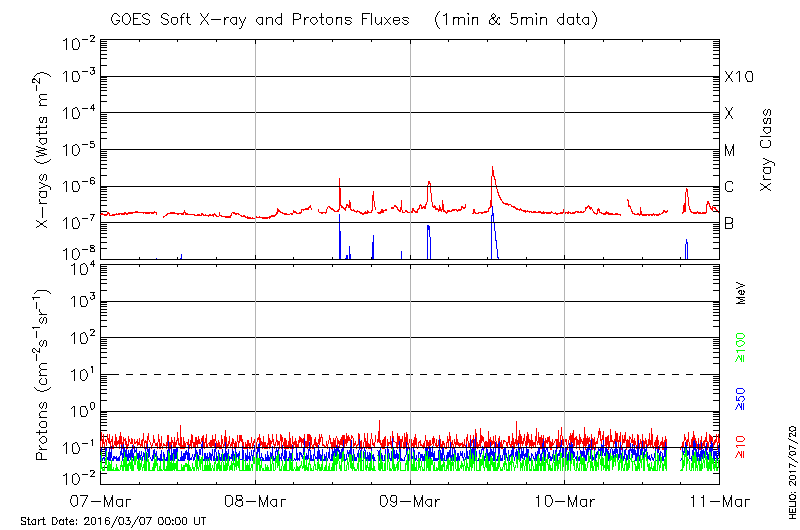 This page provides light-curves generated from GOES soft X-ray and Particle data for the date indicated at the top and the preceding three days.