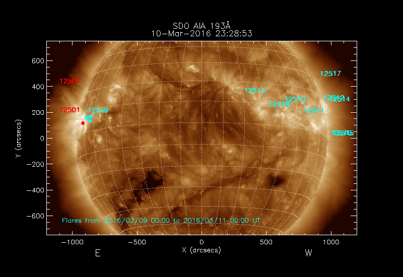 Flares for the 48 hours leading up to the time are over-plotted; these are rotated to the time of the FITS image.