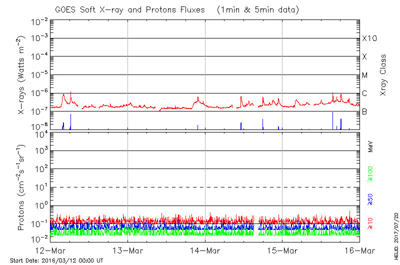 This page provides light-curves generated from GOES soft X-ray and Particle data for the date indicated at the top and the preceding three days.