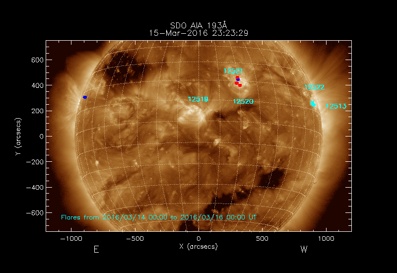 Flares for the 48 hours leading up to the time are over-plotted; these are rotated to the time of the FITS image.