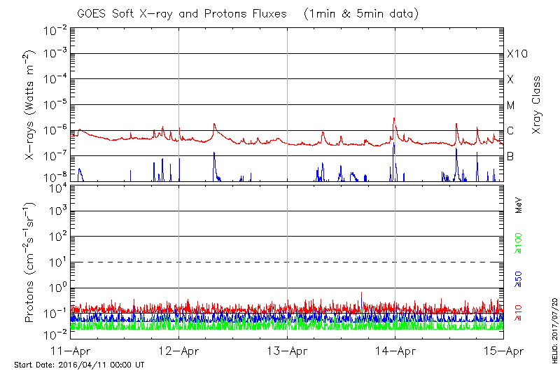 This page provides light-curves generated from GOES soft X-ray and Particle data for the date indicated at the top and the preceding three days.