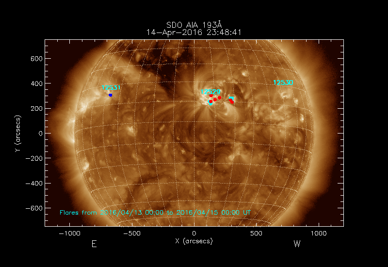 The most recent flares (≤12 hours) are shown as red dots, 12-24 hours ago as blue dots and older ones as turquoise dots.