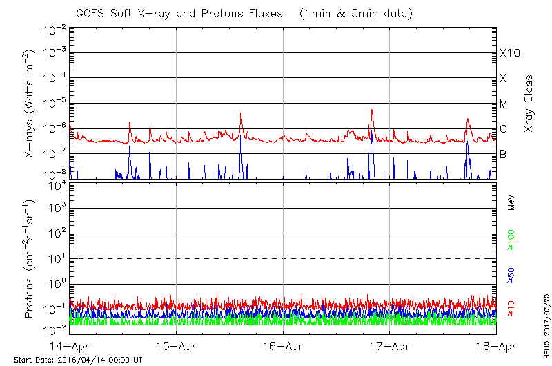 This page provides light-curves generated from GOES soft X-ray and Particle data for the date indicated at the top and the preceding three days.