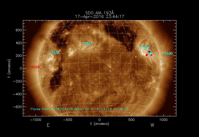 The most recent flares (≤12 hours) are shown as red dots, 12-24 hours ago as blue dots and older ones as turquoise dots.