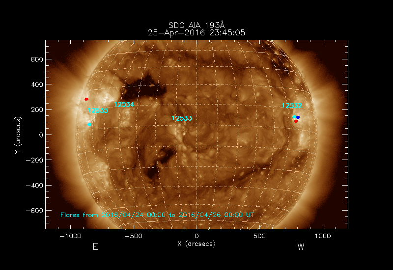 The most recent flares (≤12 hours) are shown as red dots, 12-24 hours ago as blue dots and older ones as turquoise dots.