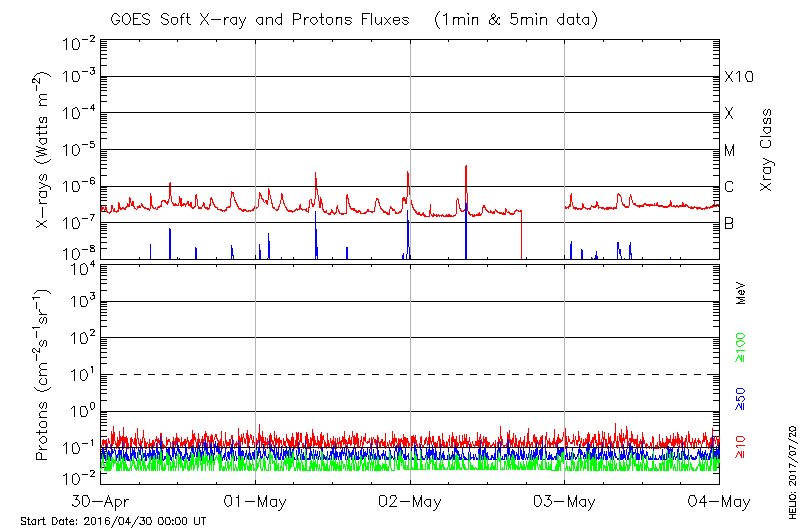 This page provides light-curves generated from GOES soft X-ray and Particle data for the date indicated at the top and the preceding three days.